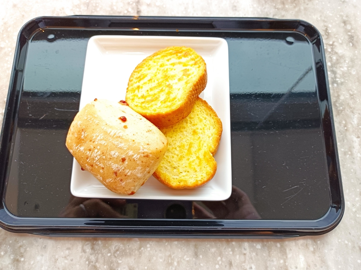 黒いカップに入っているのはコーンスープです。程よいとろみがあり味が濃くておいしくいただきました。スープだけでもお腹が膨れる感じです。