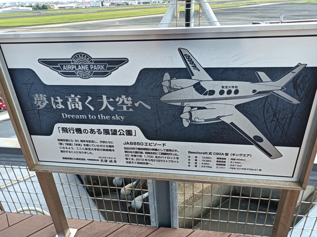 機体にも記載されていますが、航空大学校の訓練機(ビーチクラフトC90Aキングエア)だそうです。宮崎空港ビル50周年を記念し、子供たちに「夢」「希望」「未来」を感じてもらう場所になるように展示されているそうです。私が行ったときもベビーカーのご家族が来られてました。