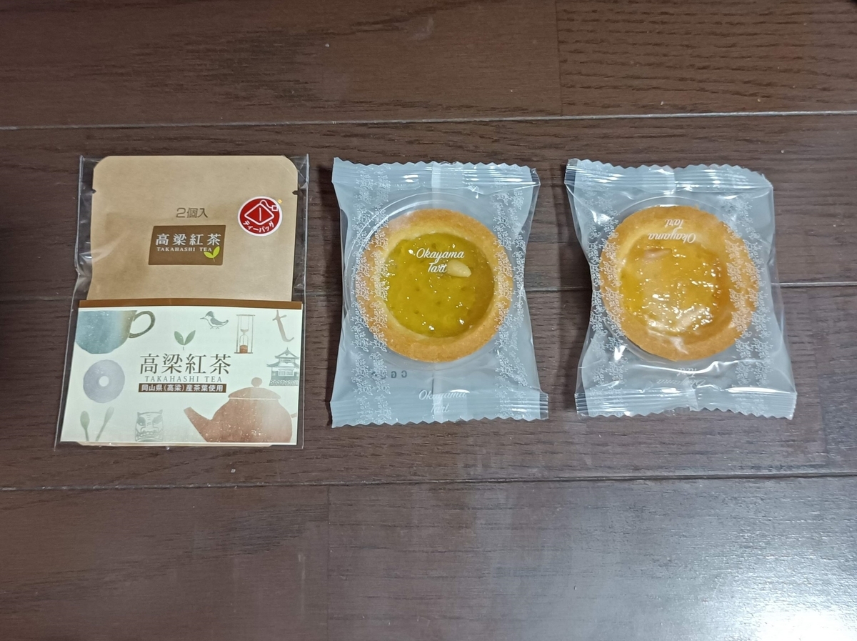 で、中を開けると高梁紅茶、岡山フルーツタルトが2個入っていました。