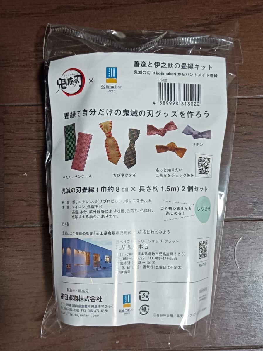 鬼滅の刃の畳縁(たたみべり)が入っていました。裏にペンケース、ちびネクタイ、リボンの作り方が紹介されていたので、今度時間があるときに作ってみようと思います。
