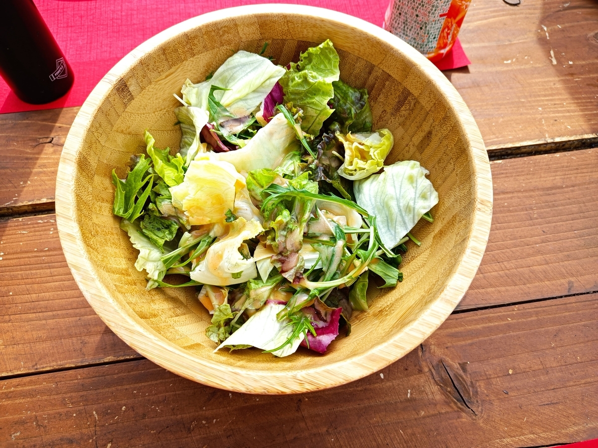 黒いカップに入っているのはコーンスープです。程よいとろみがあり味が濃くておいしくいただきました。スープだけでもお腹が膨れる感じです。