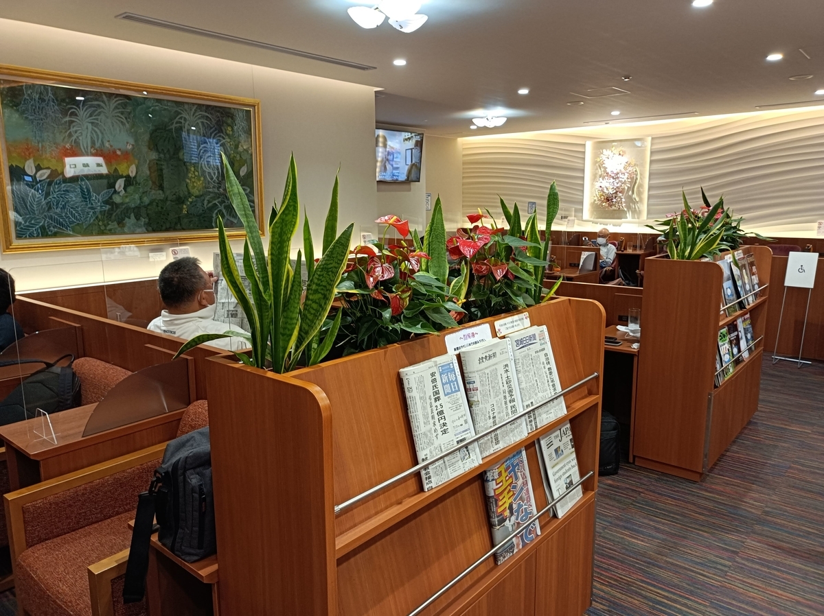 ここはANAとJALの共同ラウンジになっています。と知ったように書いていますが、じつはこれ、私がいつも楽しく拝見しているブログ「独りぼっちのお気楽マイル道 ANA SFC 思想 たまには贅沢いいんじゃない?」のハナサクcoroさまに教えてもらいました。